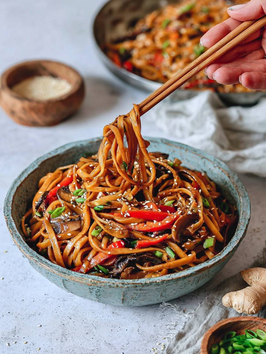 Um deine gebratenen Asia Nudeln etwas aufzupeppen, probiere doch statt roten Paprika auch gelbe oder grüne Paprika aus. Für eine zusätzliche Geschmacksnote kannst du anstelle von Champignons auch Shiitake-Pilze verwenden. Sei kreativ mit dem Gemüse – Karotten oder Brokkoli sind ebenfalls tolle Alternativen!