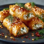 Garnieren Sie die knusprigen Feta-Rollen abschließend mit frischem Dill und servieren Sie sie umgehend. So genießen Sie den Teig in seiner knusprigsten Form und das volle Aroma.