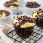- Using a skewer or a knife, gently swirl the cheesecake mixture into the chocolate batter to create a marbled effect. Sprinkle the remaining ¼ cup chocolate chips over the tops of the muffins.