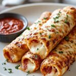 Diese goldbraunen Brotstangen sind außen knusprig und innen herrlich weich, gefüllt mit geschmolzenem Mozzarella und einer würzigen Pizzasoße. Mit einer weiteren Schicht Käse überbacken und mit frischer Petersilie garniert, bieten sie einen herzhaften Genuss. Sie werden warm serviert und sind ideal zum Dippen in eine klassische Marinara-Soße.