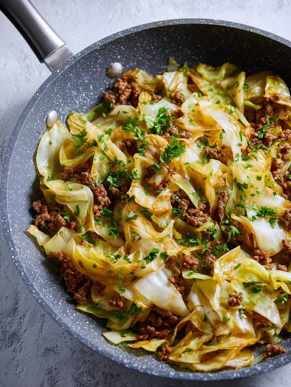 Diese herzhafte Kohl-Hack-Pfanne vereint zarten, leicht karamellisierten Weißkohl mit würzigem Rinderhackfleisch zu einem ausgewogenen und sättigenden Gericht. Die einfache Zubereitung in einer einzigen Pfanne macht es zu einer idealen Option für eine schnelle und nahrhafte Mahlzeit. Der Kohl wird sanft geschmort, bis er weich ist, während das Hackfleisch eine aromatische Basis bildet. Frische Petersilie rundet den Geschmack ab und sorgt für eine ansprechende Optik.