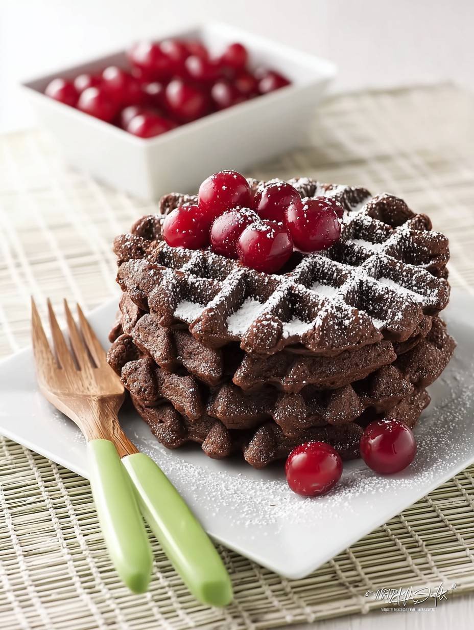 Diese Schokowaffeln bieten ein reichhaltiges Kakaoaroma und eine angenehm weiche Textur im Inneren, umhüllt von einer leicht knusprigen Oberfläche. Die Süße des Teigs wird durch die fruchtige Säure frischer oder aufgetauter Kirschen perfekt ergänzt. Eine leichte Puderzuckerschicht rundet das Gebäck optisch und geschmacklich ab. Sie werden im Waffeleisen goldbraun gebacken und sind eine köstliche Wahl für Frühstück, Brunch oder als Dessert.
