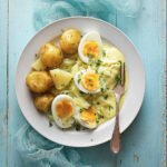 2. Während die Kartoffeln backen, die Eier in kochendem Wasser für 6-8 Minuten kochen, je nachdem, wie flüssig das Eigelb sein soll. Anschließend sofort in Eiswasser abschrecken, pellen und halbieren.