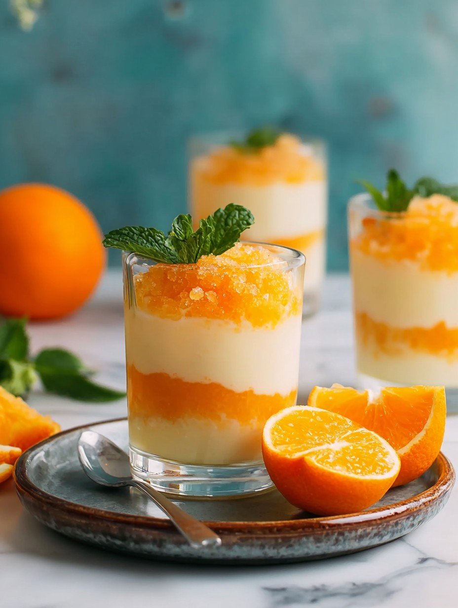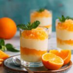 - **Schichten:** Die Gläser abwechselnd mit der Orangencreme und der abgekühlten Orangenschicht befüllen. Beginnen Sie mit einer Schicht Creme, gefolgt von einer Schicht Orange und dann wieder Creme. Stellen Sie die Gläser für mindestens 2 Stunden in den Kühlschrank, damit die Schichten fest werden.