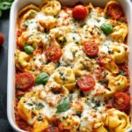 Dieser Tortellini-Auflauf vereint zarte, gefüllte Tortellini mit einer reichhaltigen Tomatensauce, saftigen Kirschtomaten und geschmolzenem Mozzarella zu einem herzhaften Gericht. Im Ofen gebacken, entwickelt der Käse eine goldbraune Kruste, während die Tomaten leicht karamellisieren und ihre Süße entfalten. Frische Kräuter runden das Aroma ab und verleihen dem Auflauf eine mediterrane Note. Ein unkompliziertes Gericht, das Komfort und Geschmack harmonisch verbindet.