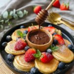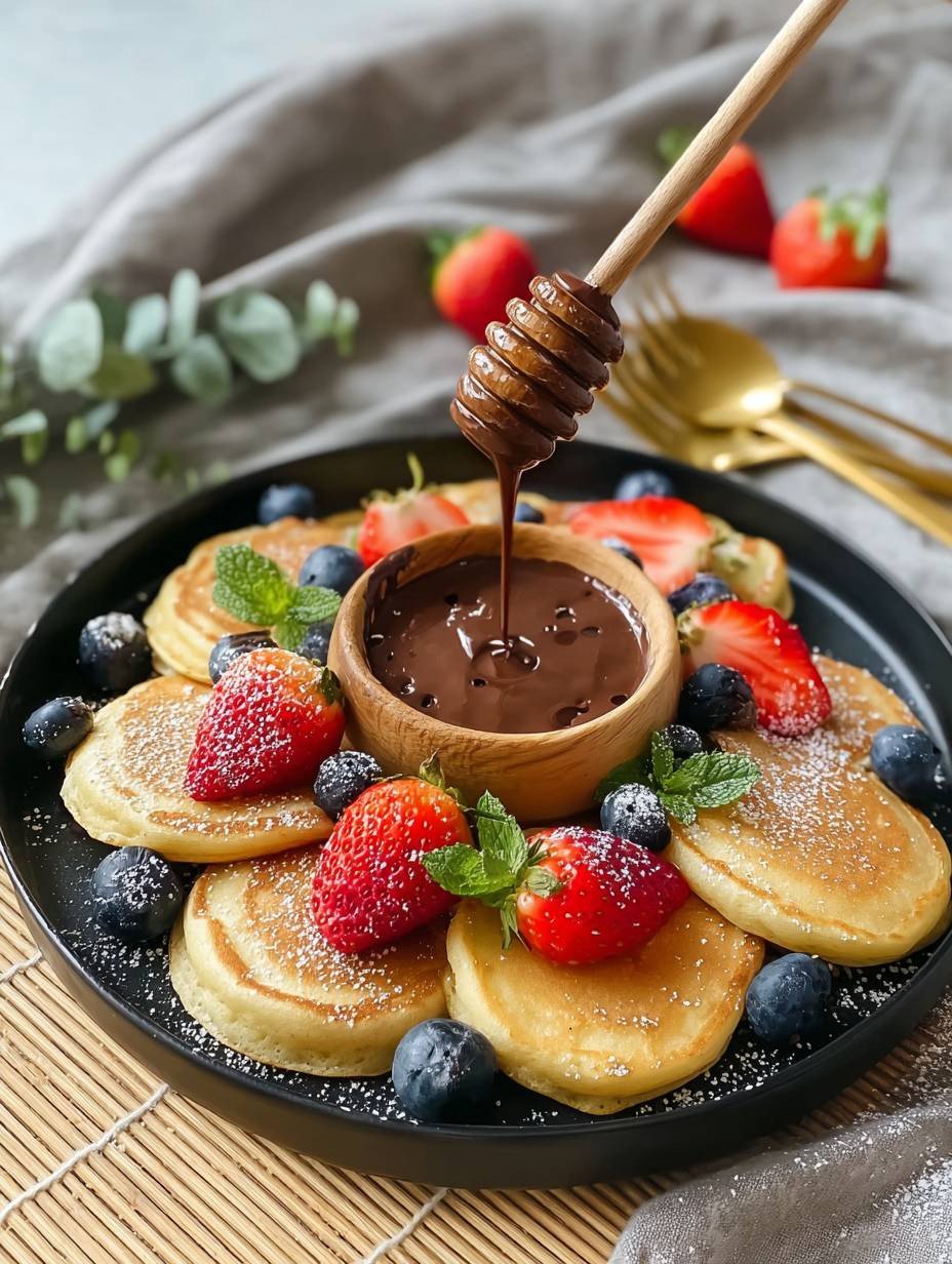 Ein Biss in diese himmlisch weichen, goldbraun gebackenen Mini-Pfannkuchen, die förmlich auf der Zunge zergehen, umhüllt von süßer Schokolade und spritzigen Beeren – das ist pures Glück. Der Duft von warmem Teig und fruchtiger Süße erfüllt sofort den Raum.