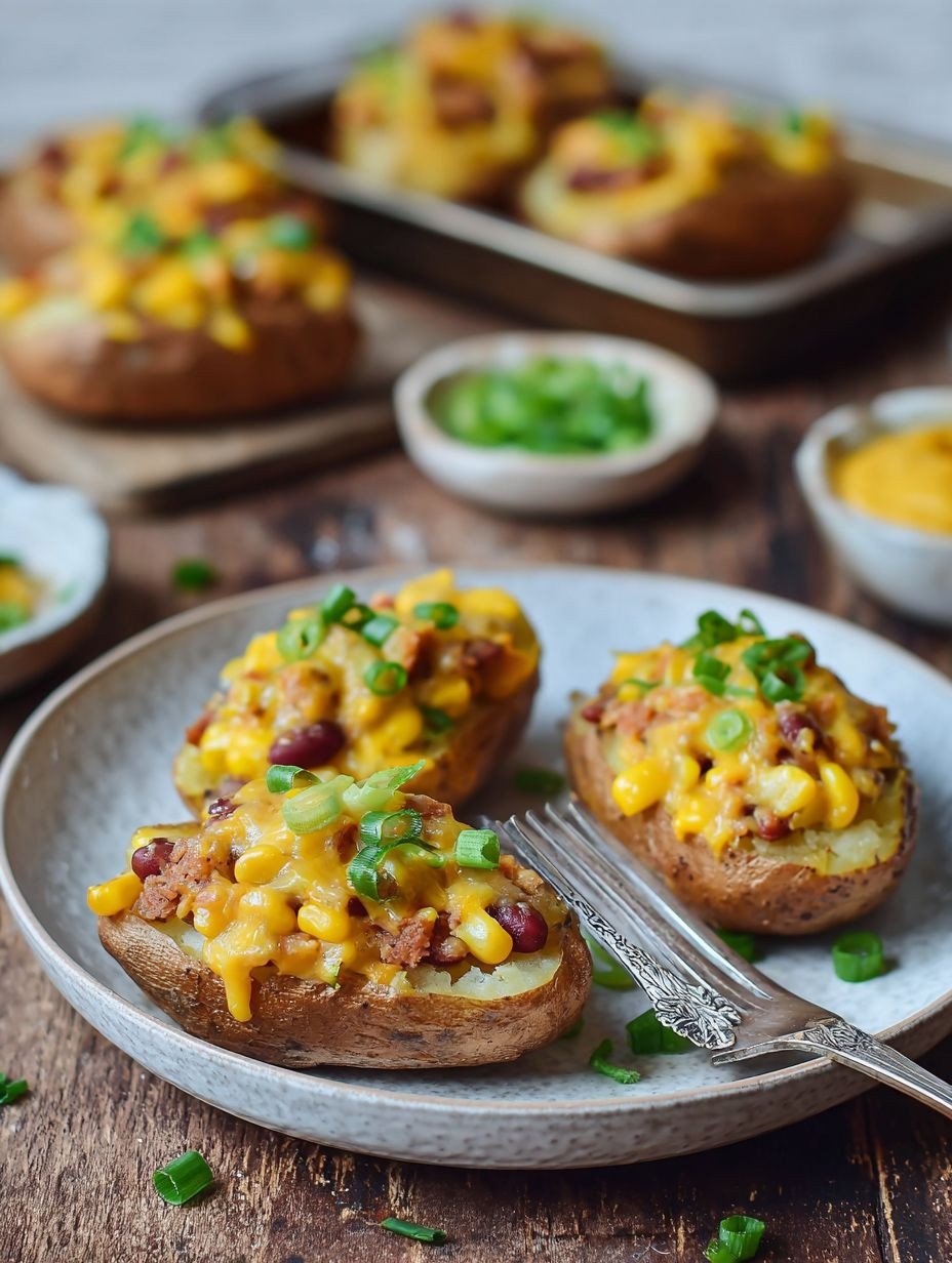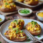 Diese herzhaften gefüllten Ofenkartoffeln bieten eine wunderbare Kombination aus Texturen und Aromen. Die goldbraun gebackene Kartoffelschale umschließt ein cremiges Inneres, das mit einer reichhaltigen Füllung aus süßem Mais, herzhaften Kidneybohnen und einem würzigen Hackfleischersatz vermischt ist. Überbacken mit geschmolzenem Käse und garniert mit frischen Frühlingszwiebeln, entsteht ein ausgewogenes Gericht, das sowohl sättigend als auch geschmackvoll ist. Die Zubereitung im Ofen sorgt für eine gleichmäßige Garung und eine appetitliche Bräunung.