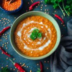 Diese wärmende Linsensuppe vereint die erdigen Aromen von roten Linsen mit der cremigen Süße von Kokosmilch. Verfeinert mit aromatischen Gewürzen und einem Hauch von frischer Säure, bietet sie eine harmonische Geschmackskomposition. Die Suppe wird auf dem Herd gekocht, bis die Linsen weich sind und eine sämige Textur entsteht, die durch einen Schuss Kokosmilch und frische Kräuter abgerundet wird.