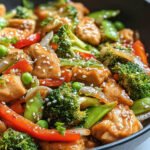 Dieses Gericht präsentiert zarte Hähnchenbruststücke, kombiniert mit einer lebendigen Mischung aus frischem Gemüse. Brokkoliröschen, knackige rote Paprika, süße Zuckerschoten und zarte Erbsen werden pfannengerührt, um ihren natürlichen Biss und ihre Farbe zu bewahren. Geschnittene Zwiebeln verleihen eine subtile aromatische Tiefe. Alles ist mit einer herzhaften, leicht süßlichen und glänzenden Sauce überzogen, garniert mit geröstetem Sesam und frischen Frühlingszwiebeln. Dieses Pfannengericht bietet eine ausgewogene Kombination aus magerem Protein und gesundem Gemüse und ergibt eine sättigende und geschmackvolle Mahlzeit.