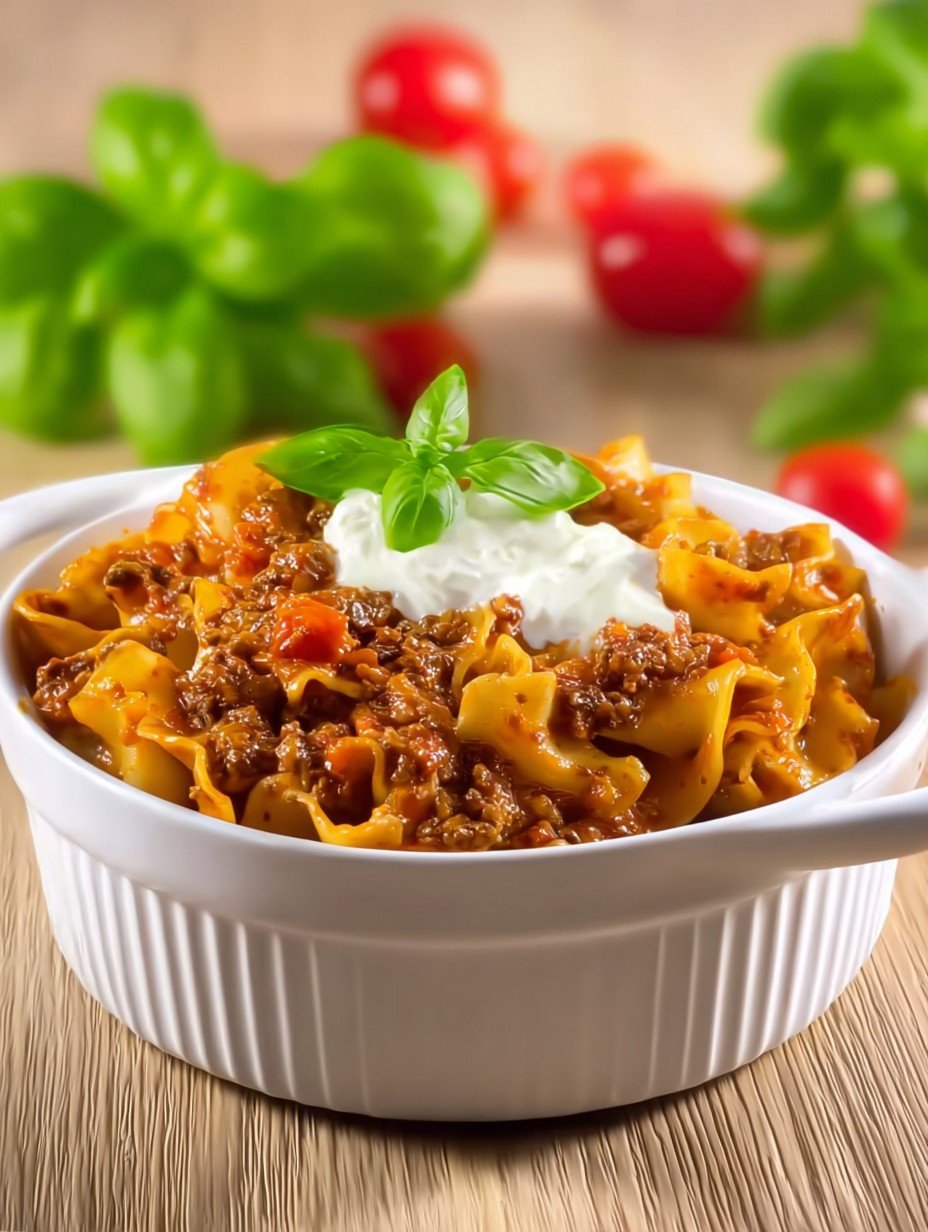 Diese herzhafte One Pot Pasta mit Hackfleisch & Schmand ist nicht nur ein Gaumenschmaus, sondern auch ein echter Lebensretter für alle, die wenig Zeit, aber großen Appetit haben. Ihre Einfachheit ist unschlagbar: Alles landet in einem Topf, was den Abwasch minimiert und die Zubereitung zum Kinderspiel macht. Das einzigartige Aromenprofil aus kräftiger Tomaten-Hackfleischsauce, verfeinert mit aromatischen Kräutern und abgerundet durch eine cremige Haube aus Schmand, bietet ein vollmundiges Geschmackserlebnis. Optisch ansprechend mit frischem Basilikum garniert, beeindruckt es auch Gäste. Zudem ist es wunderbar vielseitig – ob mit extra Gemüse oder als vegetarische Variante, dieses Gericht lässt sich leicht an persönliche Vorlieben anpassen und bietet immer wieder eine köstliche Überraschung.