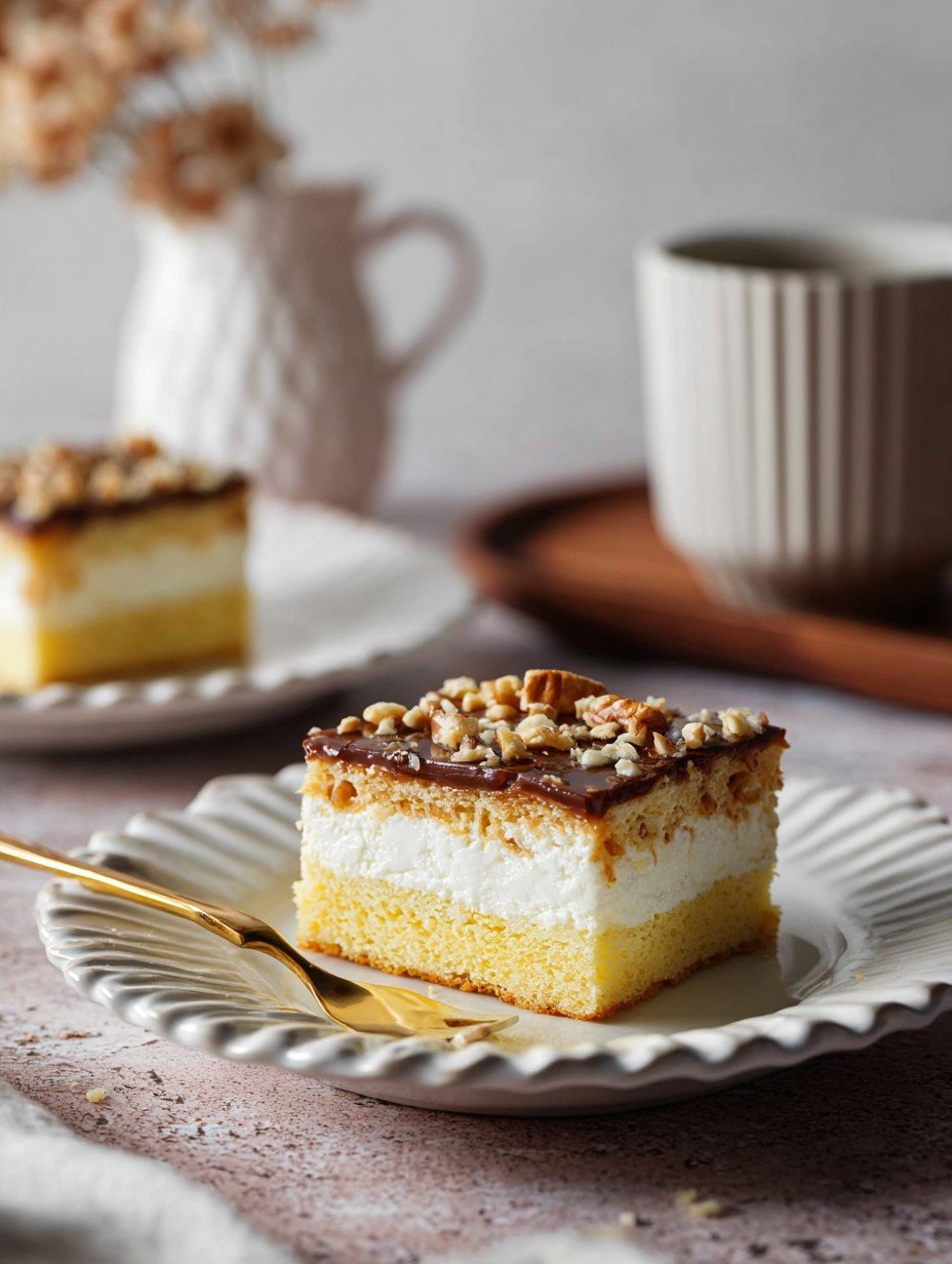 Stellen Sie sich vor: ein federleichter Biskuitboden, darüber eine Wolke aus zarter Milchcreme, umhüllt von einer sanften Karamellschicht und gekrönt von glänzender Schokolade mit knusprigen Nüssen. Jeder Bissen dieses Himmlischen Blechkuchens mit Sahne und Schokolade ist ein kleines Fest für die Sinne, eine perfekte Harmonie aus Süße und Textur.