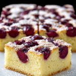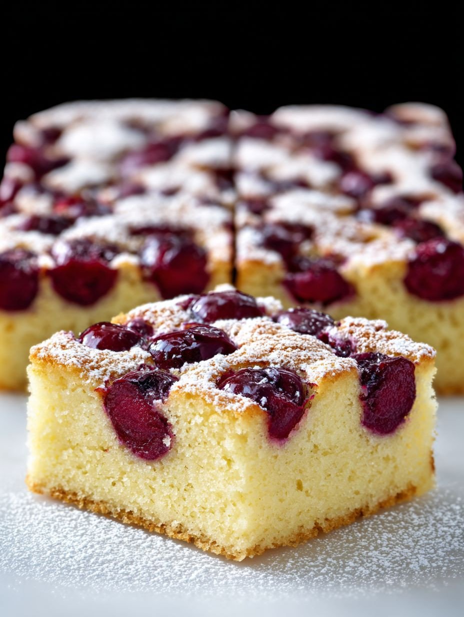 Ein leichter und luftiger Blechkuchen mit saftigen, säuerlichen Kirschen, eingebettet in einen zarten Sandkuchenboden. Der Kuchen ist sanft mit Puderzucker bestäubt und bietet eine feine Süße, die die Frucht perfekt ergänzt. Im Ofen gebacken, präsentiert dieser Kuchen eine harmonische Balance aus weicher Textur und lebendigem Fruchtgeschmack.