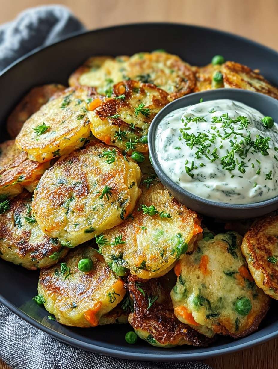 Diese Gemüsepfannkuchen sind eine köstliche und vielseitige Beilage oder leichte Hauptspeise. Sie zeichnen sich durch eine goldbraune, leicht knusprige Oberfläche und einen weichen, saftigen Kern aus, der mit feinen Gemüsestückchen wie Karotten und Erbsen sowie frischen Kräutern angereichert ist. Serviert werden sie mit einem cremigen Kräuterdip, der eine frische und würzige Note beisteuert und die herzhaften Pfannkuchen perfekt ergänzt. Die Zubereitung erfolgt durch schonendes Braten in der Pfanne, was ihnen ihre ansprechende Textur und Farbe verleiht.