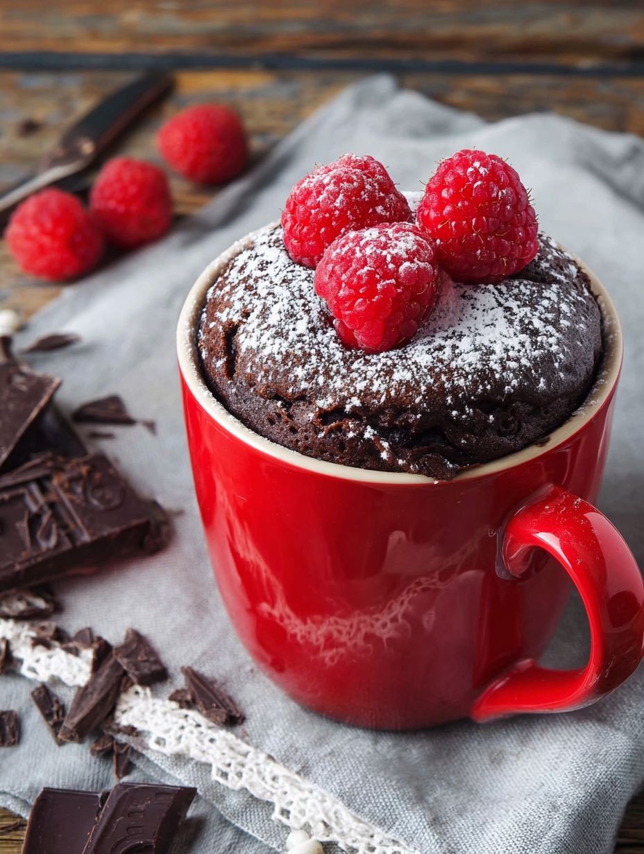 Dieser schnelle Tassen-Brownie bietet einen intensiven Schokoladengeschmack mit einer wunderbar feuchten und fudgy Textur. Er wird direkt in der Tasse in der Mikrowelle zubereitet und ist mit einer leichten Puderzuckerschicht und frischen Himbeeren garniert, die eine fruchtige Note hinzufügen. Ein unkomplizierter Genuss für spontane Süßgelüste.