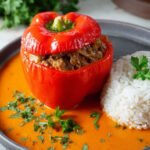Diese gefüllten Paprikaschoten präsentieren sich als herzhaftes und farbenfrohes Gericht. Eine leuchtend rote Paprikaschote wird mit einer würzigen Füllung aus saftigem Rinderhackfleisch, Reis und aromatischen Gewürzen zubereitet. Die Paprika wird zart gegart, wodurch sie eine weiche Textur erhält, die perfekt mit der reichhaltigen Füllung harmoniert. Serviert wird sie in einer cremigen, tomatenbasierten Soße, die mit frischer Petersilie verfeinert ist und von lockerem Reis begleitet wird. Ein klassisches Gericht, das sowohl wärmend als auch sättigend ist.