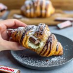 Diese köstlichen Croissants vereinen die zarte Blätterteigstruktur mit einer unwiderstehlichen Füllung aus cremigem Kinderriegel. Nach dem Backen entfaltet sich der Schokoriegel zu einem weichen, schmelzenden Kern, der perfekt mit dem buttrigen Gebäck harmoniert. Eine feine Schokoladenglasur und Puderzucker runden das Geschmackserlebnis ab und verleihen dem Gebäck eine ansprechende Optik. Ideal als süße Frühstücksüberraschung oder zum Kaffee.