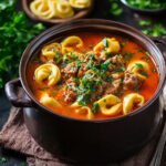 Der Duft von würzigem Rinderhackfleisch, zarten Tortellini und frischen Kräutern, vereint in einer reichhaltigen Tomatenbrühe, verbreitet sich in der Küche und verspricht puren Genuss. Diese Suppe ist eine Umarmung für die Seele.