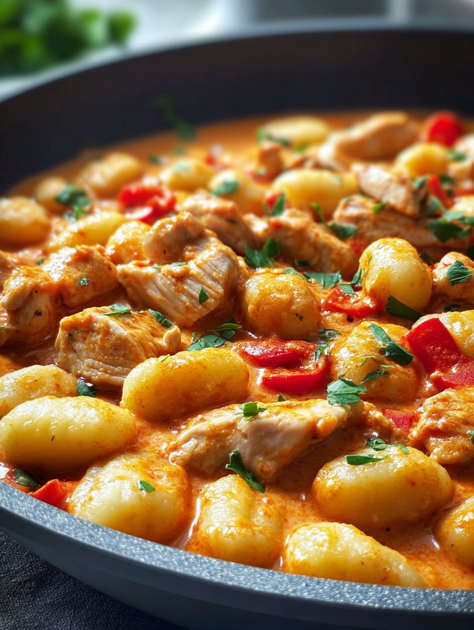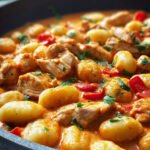 Stellen Sie sich vor: Die goldbraun angebratenen Hähnchenwürfel, umhüllt von einer samtigen, cremigen Soße, die sich perfekt an die weichen Gnocchi schmiegt, während der Duft von frischer Paprika und aromatischen Kräutern durch die Küche zieht. Ein wahrer Gaumenschmaus, der Herz und Seele wärmt.