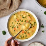 Die Konsistenz der Suppe kann durch Zugabe von mehr Brühe oder Wasser angepasst werden, falls sie zu dick ist.