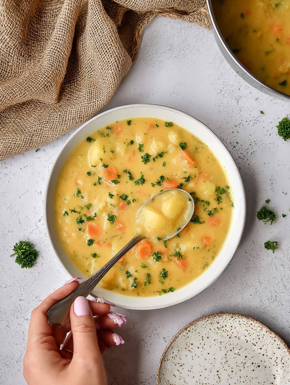 Diese **Schnelle Kartoffelsuppe: Gesund, cremig & wärmend** ist ein wahrer Genuss für kalte Tage. Sie bietet ein tiefes Wohlfühlerlebnis. Spüren Sie, wie die wohlige Wärme dieser cremigen Köstlichkeit Sie von innen durchströmt. Schmecken Sie die zarten Kartoffelstücke und die feinen Karottenwürfel, perfekt abgerundet mit frischer Petersilie. Es ist eine einfache, doch nahrhafte Mahlzeit. Lassen Sie sich von ihrem milden, wohltuenden Geschmack begeistern. Greifen Sie noch heute zu den Zutaten und zaubern Sie diese wunderbare Suppe. Ihre Lieben werden es lieben!