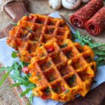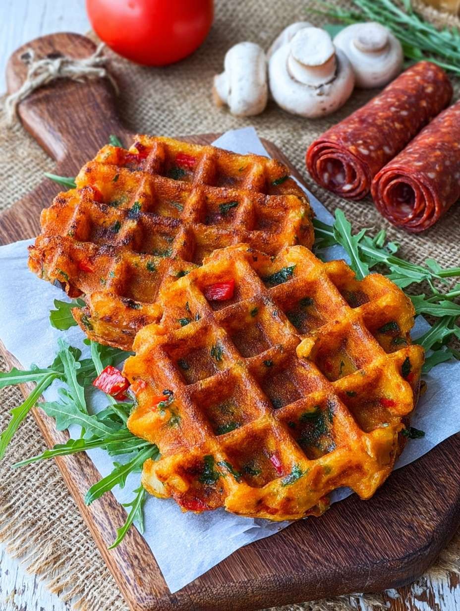 Diese herzhaften Pizza Waffeln bieten eine ansprechende Kombination aus knuspriger Außenseite und einem weichen, aromatischen Inneren. Sie sind mit feinen Stücken von roter Paprika und frischen Kräutern durchsetzt, die für eine lebendige Farbe und einen würzigen Geschmack sorgen. Der Teig wird im Waffeleisen goldbraun gebacken, wodurch eine einzigartige Textur entsteht, die an klassische Pizza erinnert, aber in einer neuen Form präsentiert wird.