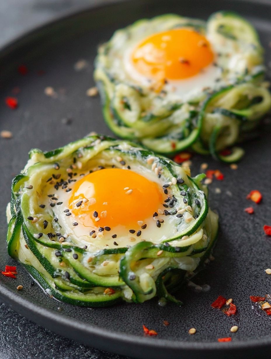 Diese Zucchini Ei Nester sind eine leichte und nahrhafte Mahlzeit, ideal für Frühstück, Brunch oder ein leichtes Abendessen. Zarte Zucchinispaghetti werden zu kleinen Nestern geformt und mit einem frischen Ei gebacken, bis das Eiweiß fest und das Eigelb cremig ist. Eine Prise Sesam und Chiliflocken verleiht eine feine Geschmacksnote und eine ansprechende Optik. Die Zubereitung im Ofen sorgt für eine gleichmäßige Garung und eine angenehme Textur der Zucchini.