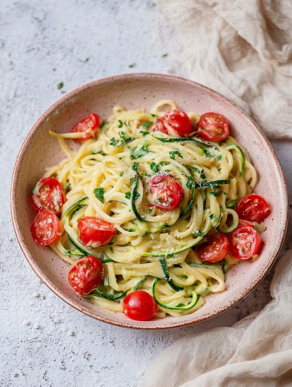 Diese **Schnelle Zucchini-Spaghetti mit Frischkäse-Soße** ist mehr als nur ein Gericht – sie ist eine Einladung, sich eine Auszeit im Alltag zu gönnen. Die harmonische Verbindung aus zarten Zucchini-Nudeln und klassischer Pasta, umhüllt von einer samtigen Frischkäsesauce, bietet ein unvergleichliches Geschmackserlebnis. Die Süße der Kirschtomaten und die Frische der Petersilie runden jeden Bissen perfekt ab. Entdecken Sie selbst, wie unkompliziert und wohltuend diese Mahlzeit sein kann. Verzaubern Sie Ihren Gaumen noch heute mit diesem cremigen Genuss!