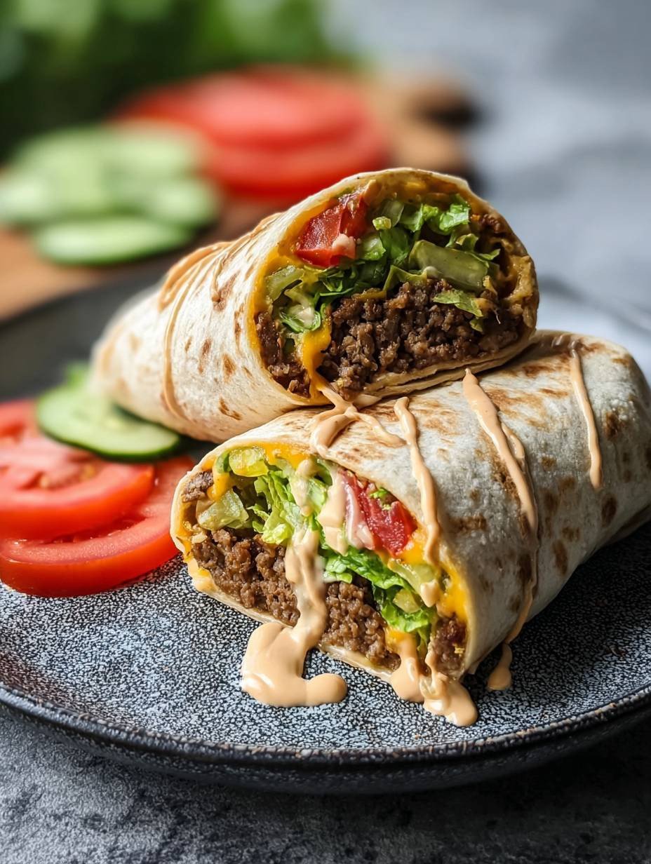 Diese Cheeseburger Wraps bieten eine köstliche Kombination aus herzhaftem Rinderhackfleisch, geschmolzenem Käse und frischen Zutaten, umhüllt von einer weichen Tortilla. Das gewürzte Hackfleisch wird mit knackigem Eisbergsalat, saftigen Tomaten und würzigen Gewürzgurken ergänzt. Eine cremige Soße rundet das Geschmackserlebnis ab und sorgt für eine harmonische Balance der Aromen und Texturen in jedem Bissen.