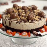 - **Dekorieren:** Die Torte vorsichtig aus der Springform lösen. Die geschmolzene Zartbitterschokolade in feinen Linien über die Torte träufeln. Anschließend die ganzen oder halbierten Schoko-Bons darauf verteilen und mit den gehackten Haselnüssen bestreuen.