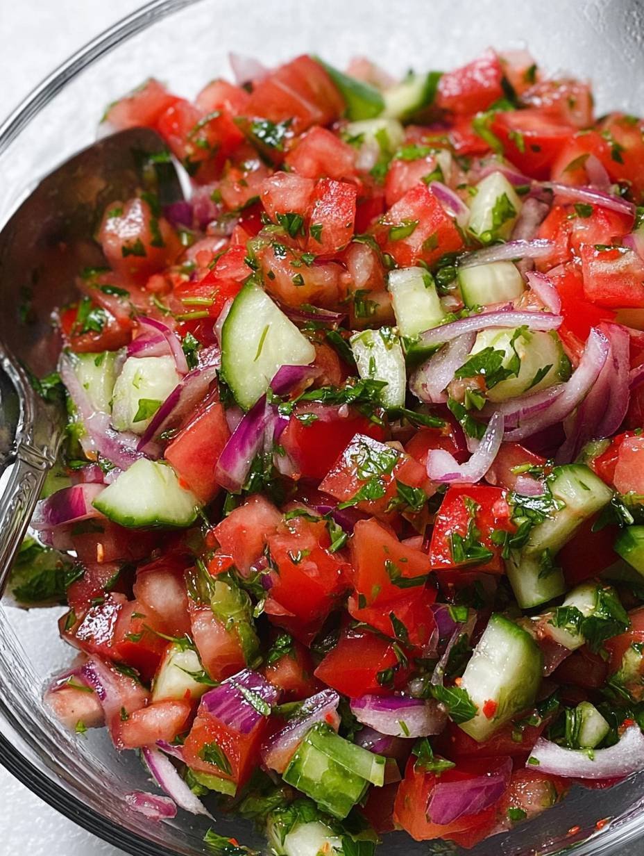 Dieser **Türkischer Tomatensalat: Einfach, frisch & würzig!** ist mehr als nur eine Beilage – er ist ein Erlebnis. Seine leuchtenden Farben und der erfrischende Geschmack bringen die Sonne auf Ihren Tisch. Die Kombination aus saftigen Tomaten, knackigen Gurken und dem pikanten Sumach-Dressing macht ihn zum perfekten Begleiter für fast jede Mahlzeit, ob Grillabend oder leichtes Mittagessen. Einfach zuzubereiten und voller Aroma, bietet dieser Salat eine willkommene Abwechslung. Probieren Sie ihn noch heute und lassen Sie sich von seiner Einfachheit und seinem unwiderstehlichen Geschmack verzaubern. Dieser frische Tomatensalat wird sicherlich schnell zu einem Favoriten in Ihrer Küche!
