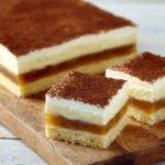 - Kühlen und Servieren: Den Kuchen für mindestens 2-3 Stunden, besser noch über Nacht, im Kühlschrank fest werden lassen. Vor dem Servieren den Kuchen in gleichmäßige Stücke schneiden und mit Kakaopulver bestäuben.