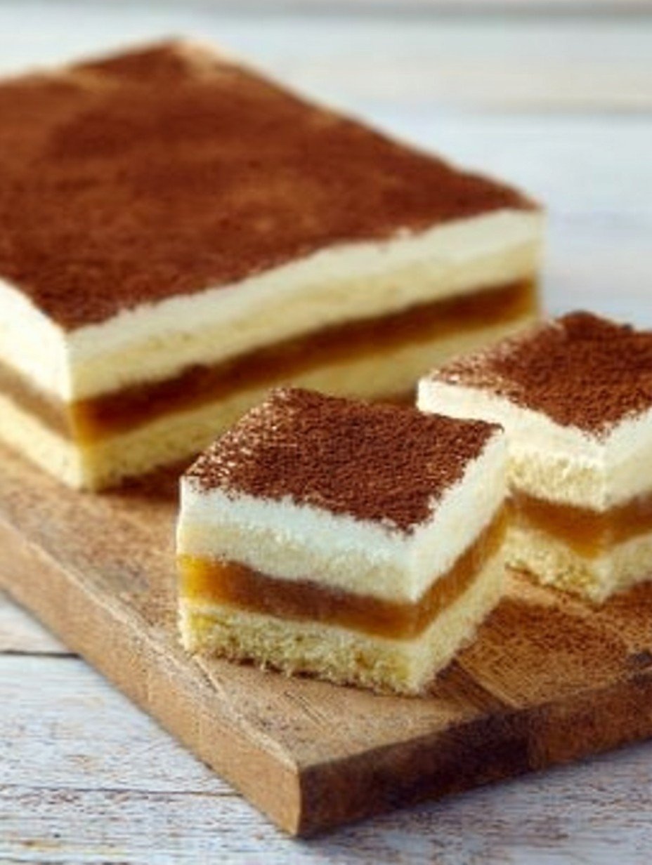 Vor dem Servieren den Kuchen in gleichmäßige Stücke schneiden und mit Kakaopulver bestäuben. Ein letzter Zaubertrick – genießen Sie jeden Bissen!