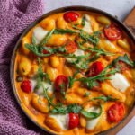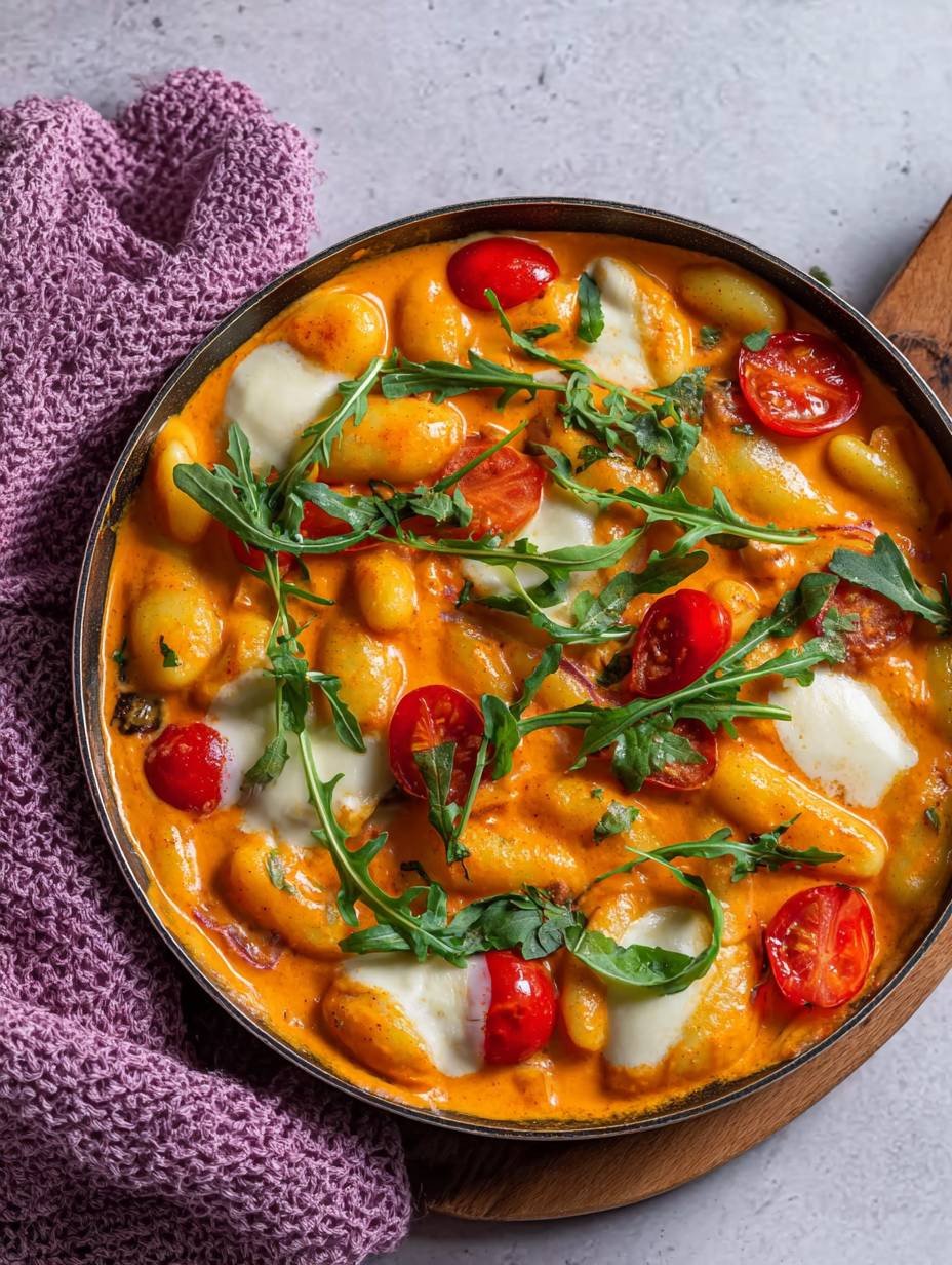 Der Duft von geschmolzenem Mozzarella, zarten Kartoffelnudeln und einer reichhaltigen Tomaten-Sahne-Sauce, durchzogen von frischen Kirschtomaten, erfüllt die Küche. Ein Hauch von Rucola verleiht dem Ganzen eine leicht pfeffrige Note – ein wahrer Gaumenschmaus für die Sinne.